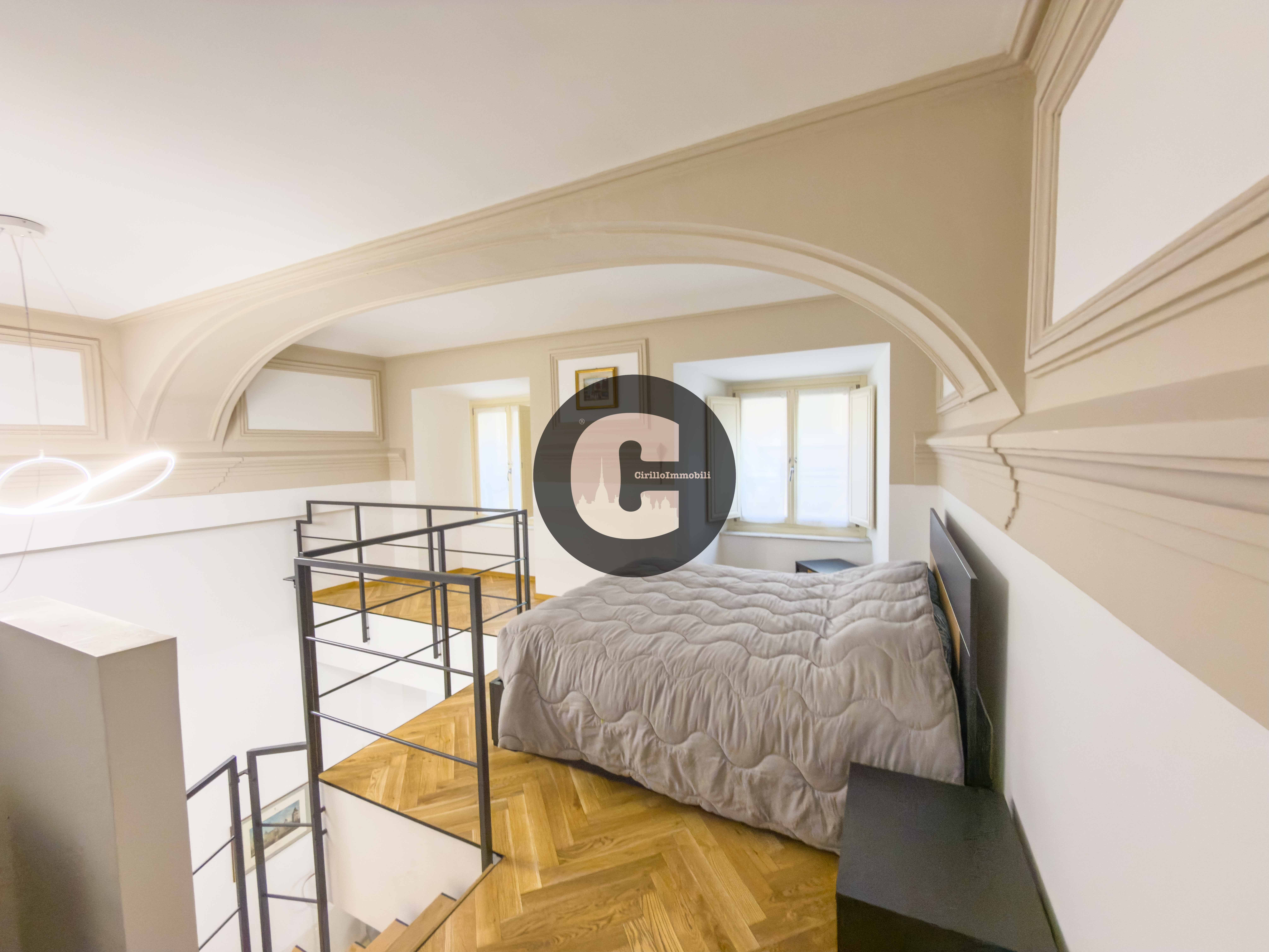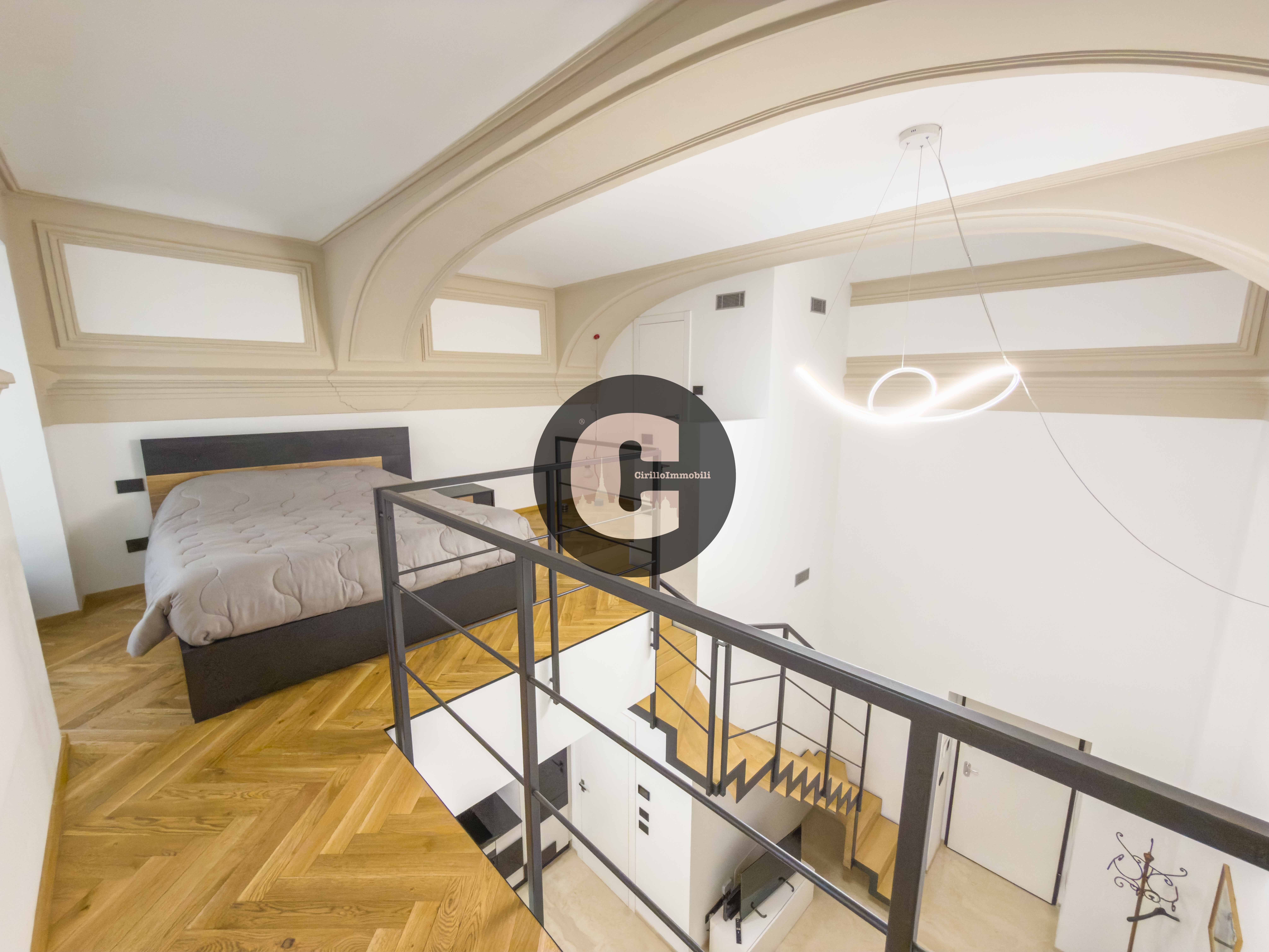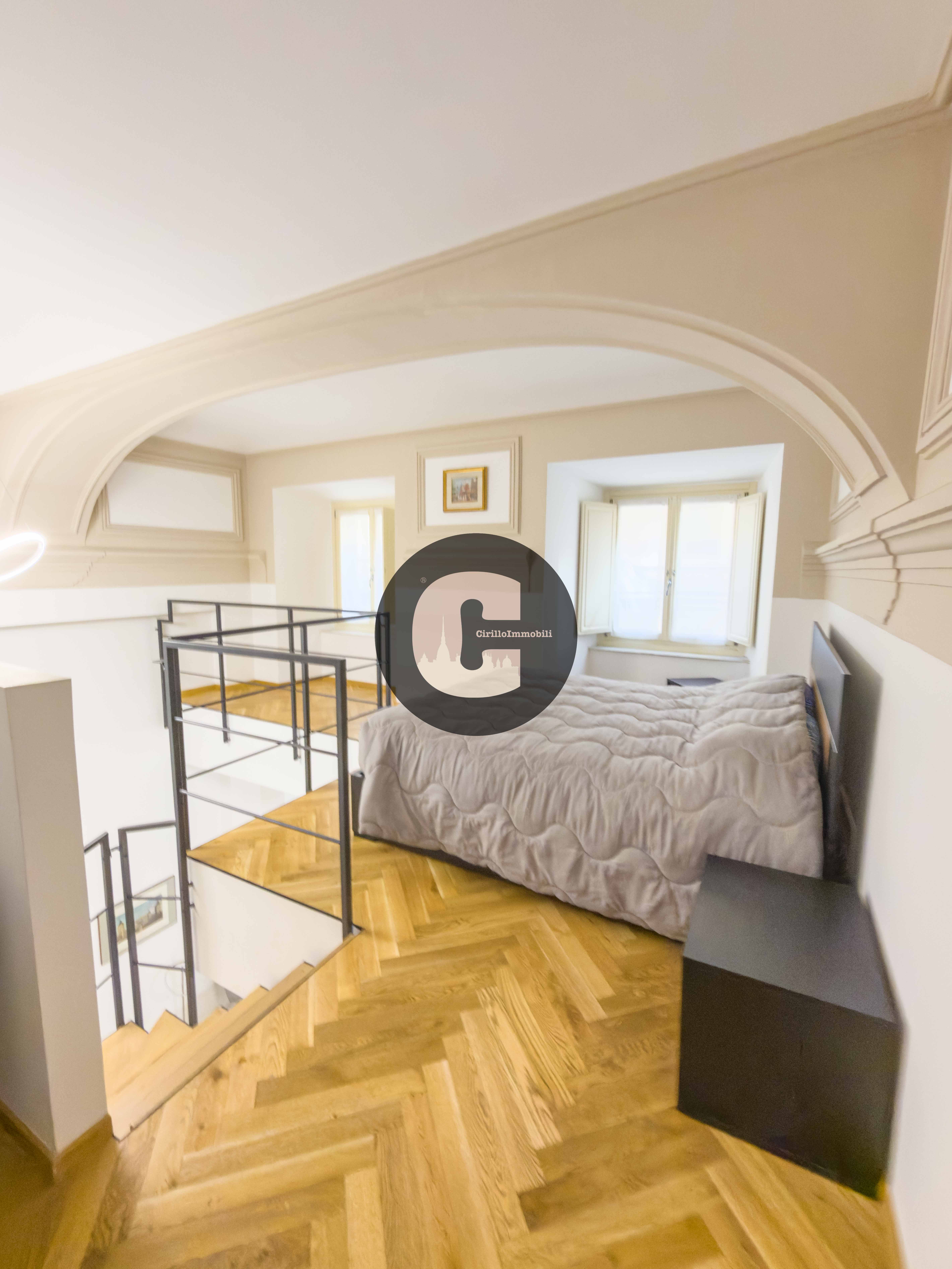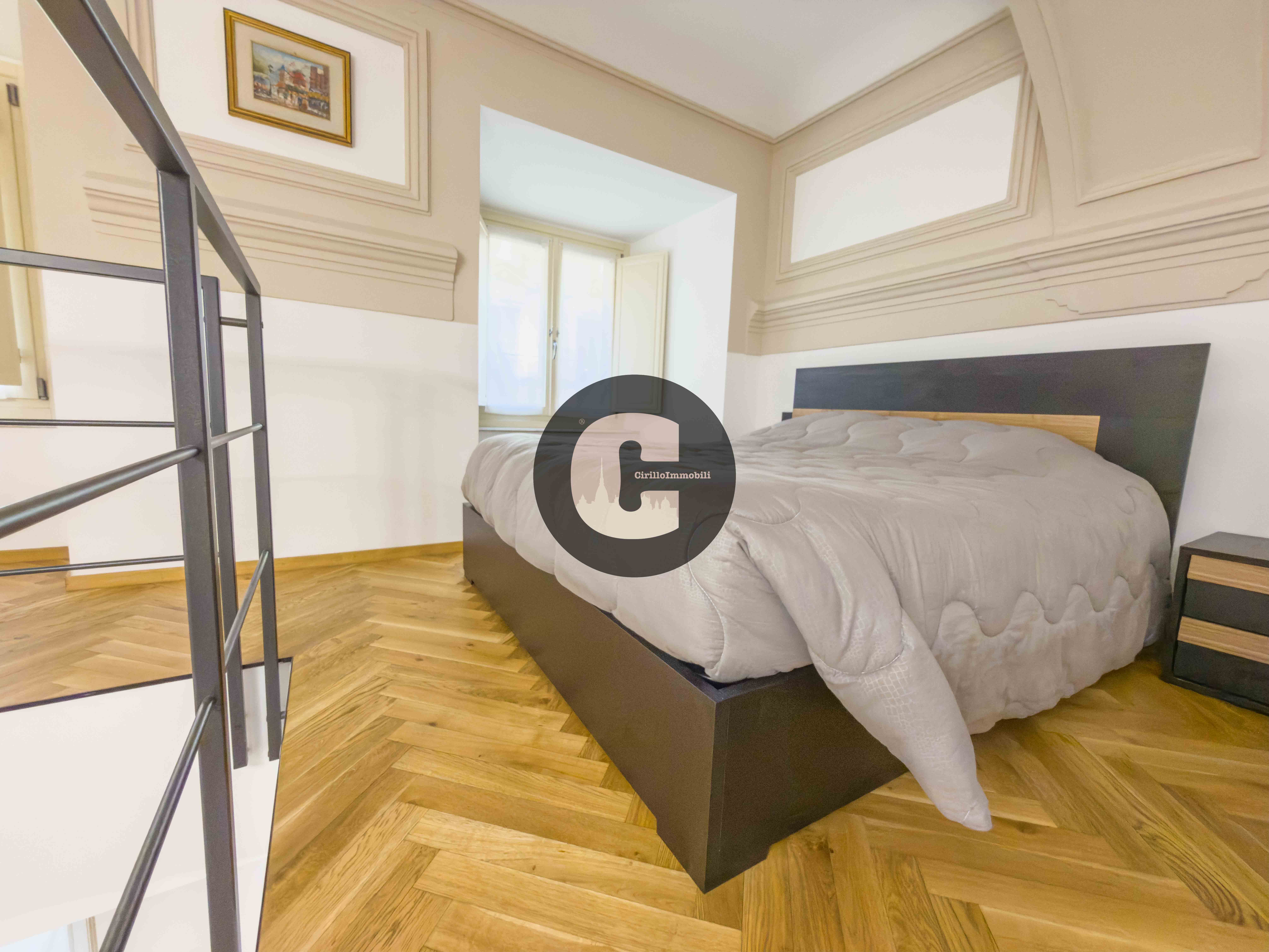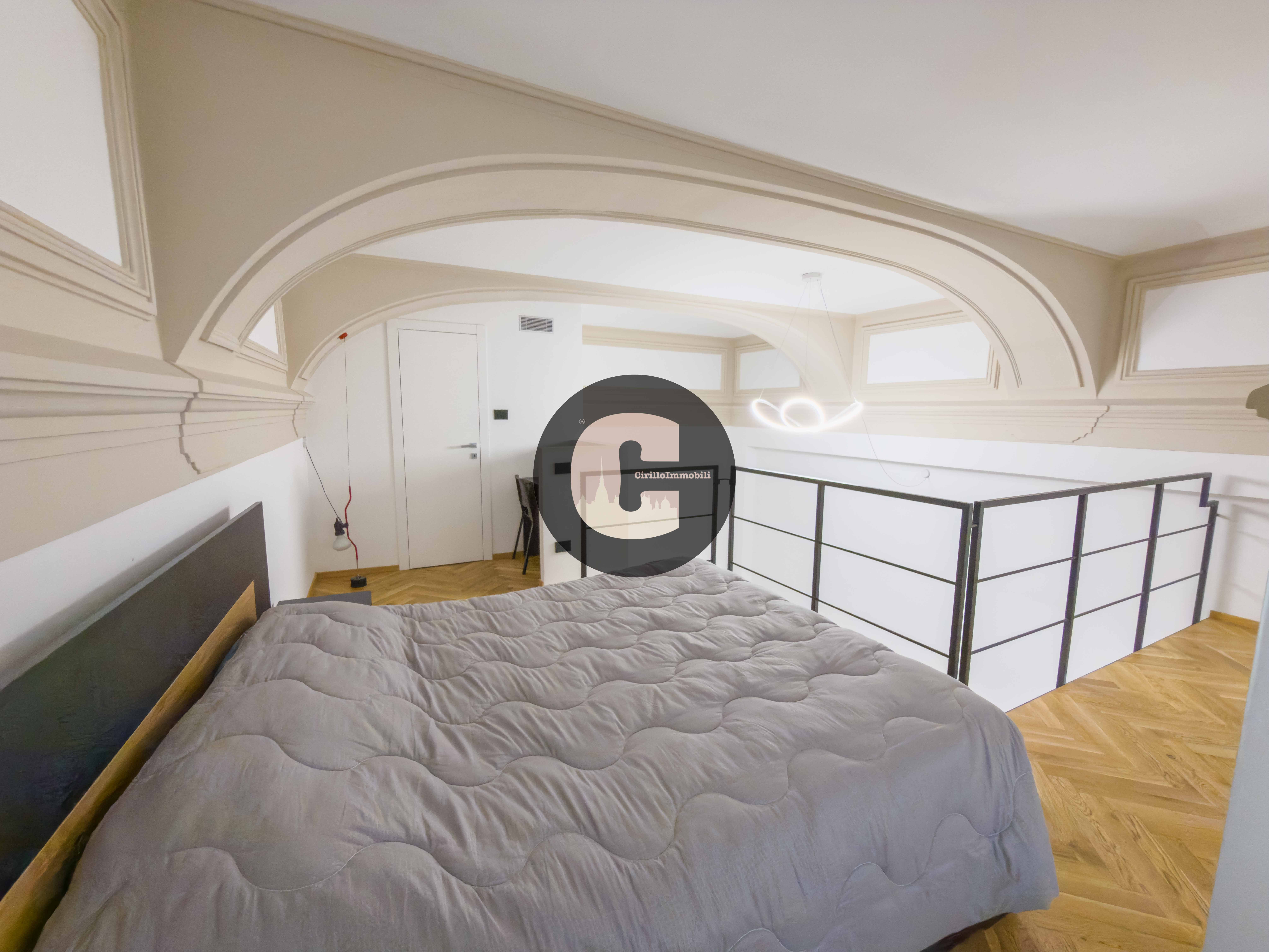 Attraverso una scala interna si accede al piano soppalcato dove troviamo la zona notte in parquet, che si presta ad accogliere un comodo letto matrimoniale e cabina armadi.